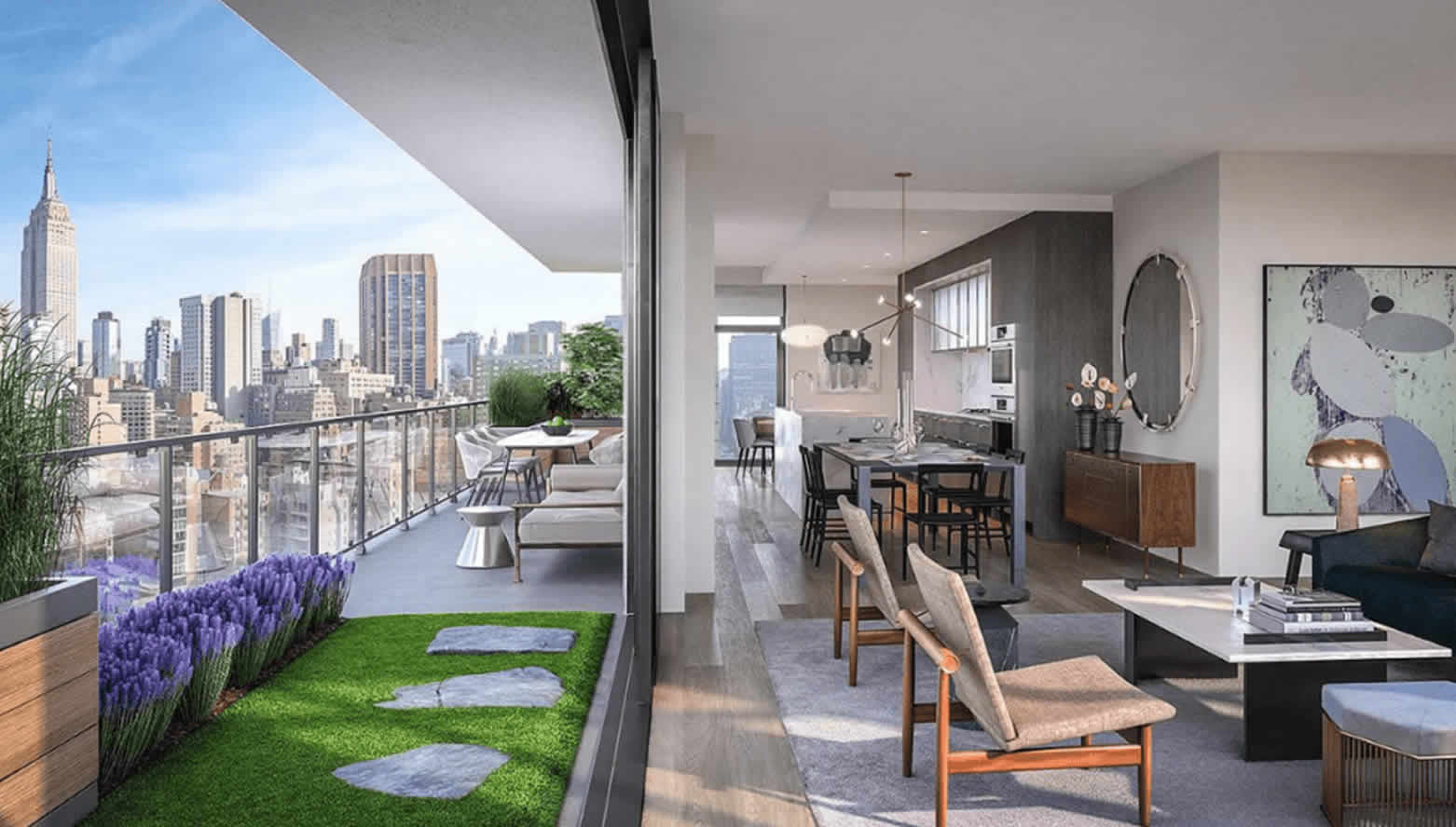 3. Rooftop Terrace Opulence – Midtown penthouses teak furniture outdoor rugs fire pits. Budget? Cry.